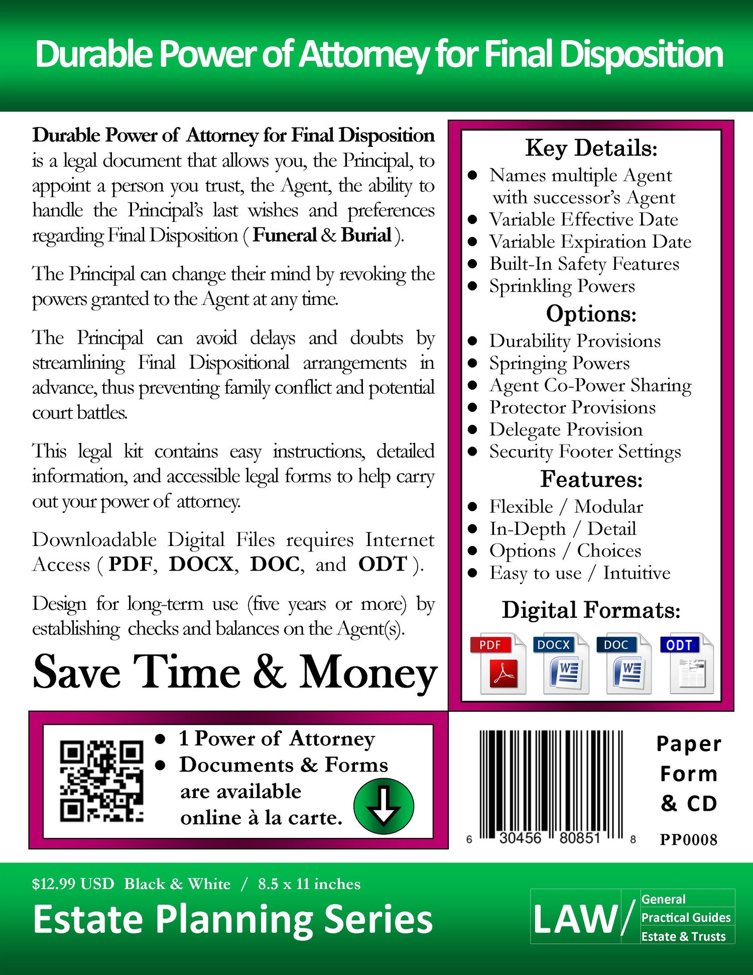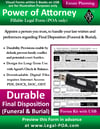 Durable Power of Attorney for Final Disposition is a legal document that allows you, the Principal, to appoint a person you trust, the Agent, the ability to handle the Principal’s last wishes and preferences regarding Final Disposition (Funeral & Burial).