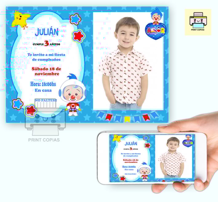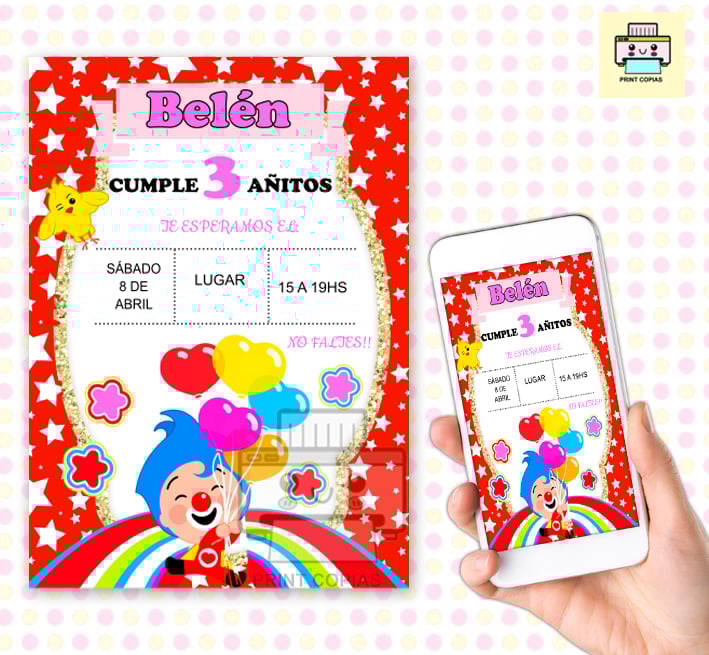 INVITACIÓN DIGITAL E IMPRIMIBLE PAYASO PLIM PLIM (MODELO A ELECCIÓN)