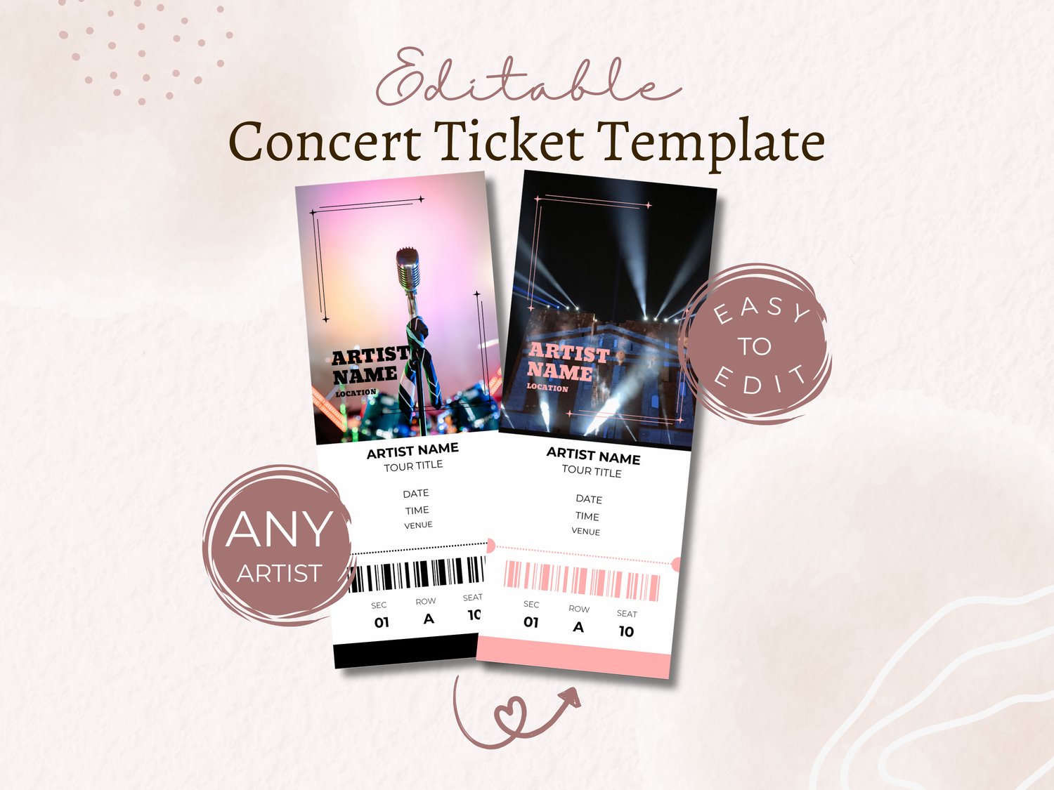 Skip the editing entirely — we’ll take care of it. Just purchase this listing and we’ll professionally personalize the template for a clean, ready-to-use result. Simply provide the name of the artist and details of the concert (date, time, location, section, row and seat information) in the personalization box.