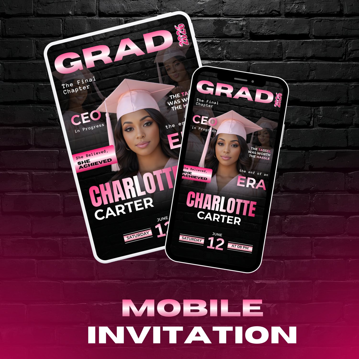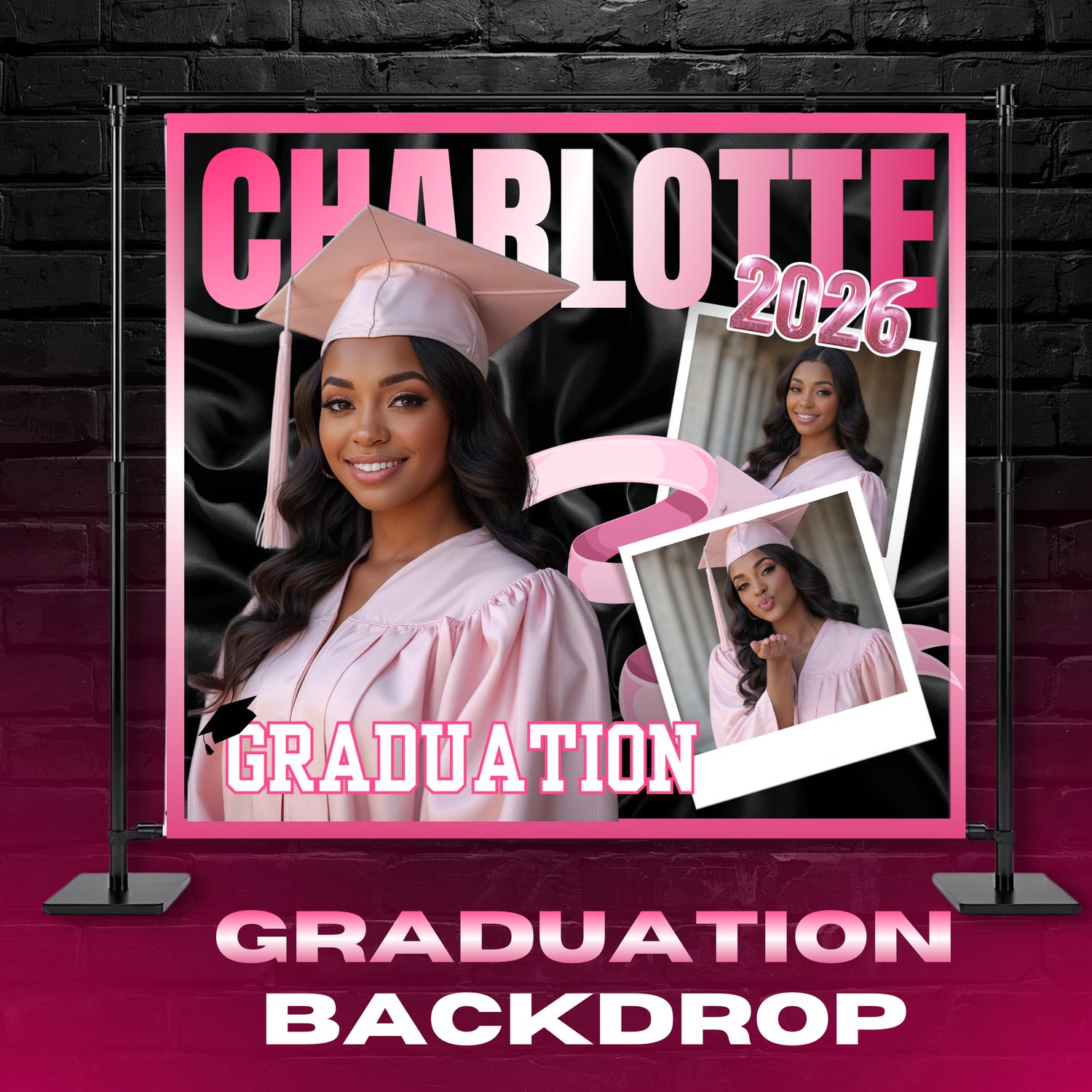Perfect for graduation parties, senior celebrations, college send-offs, or milestone events, these designs bring together glamorous pink tones with bold black accents for a confident and unforgettable look.