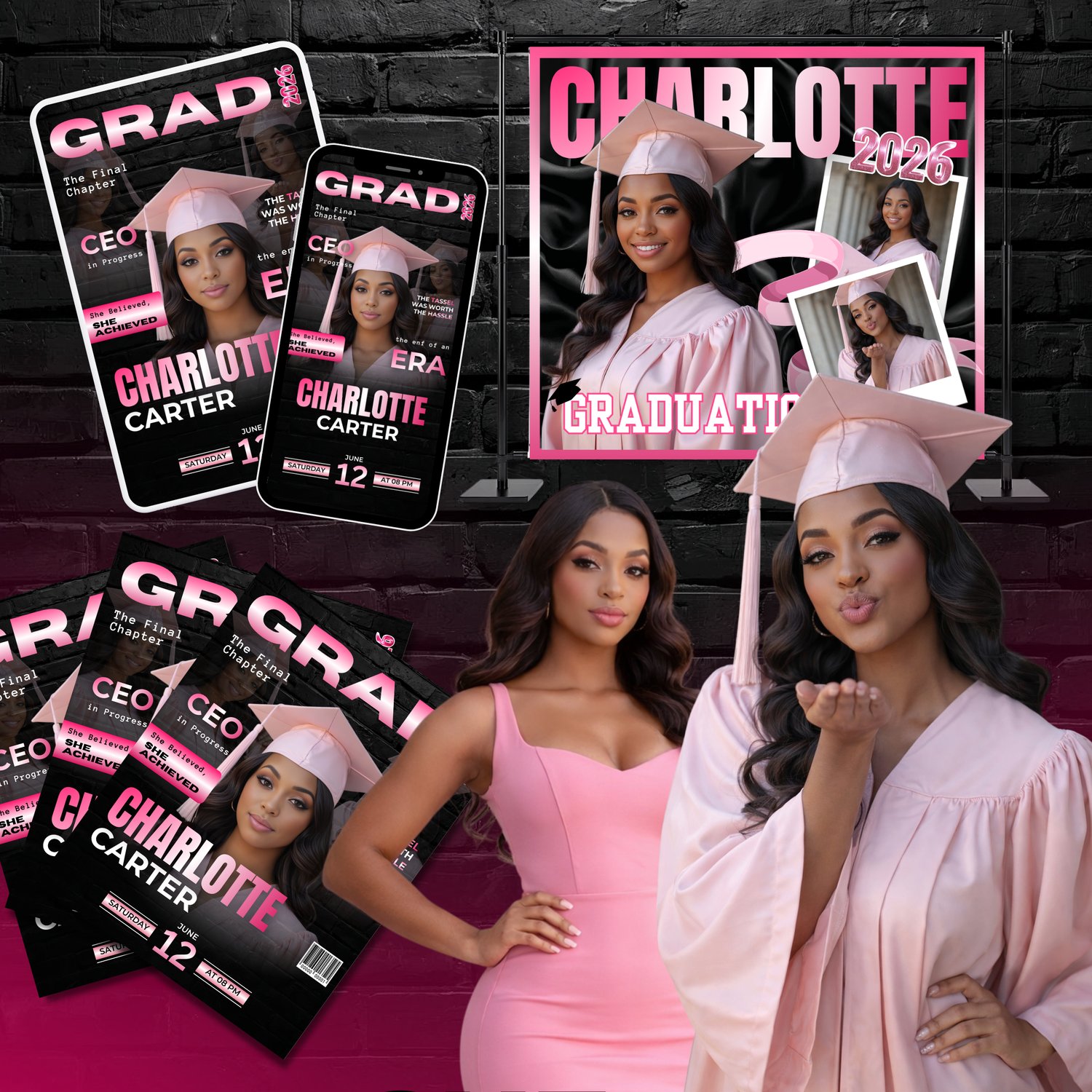 Celebrate your graduate in bold, stylish fashion with this Pink & Black Graduation Template Bundle. Designed for modern graduation parties, this set makes it easy to create a coordinated and eye-catching celebration theme.
