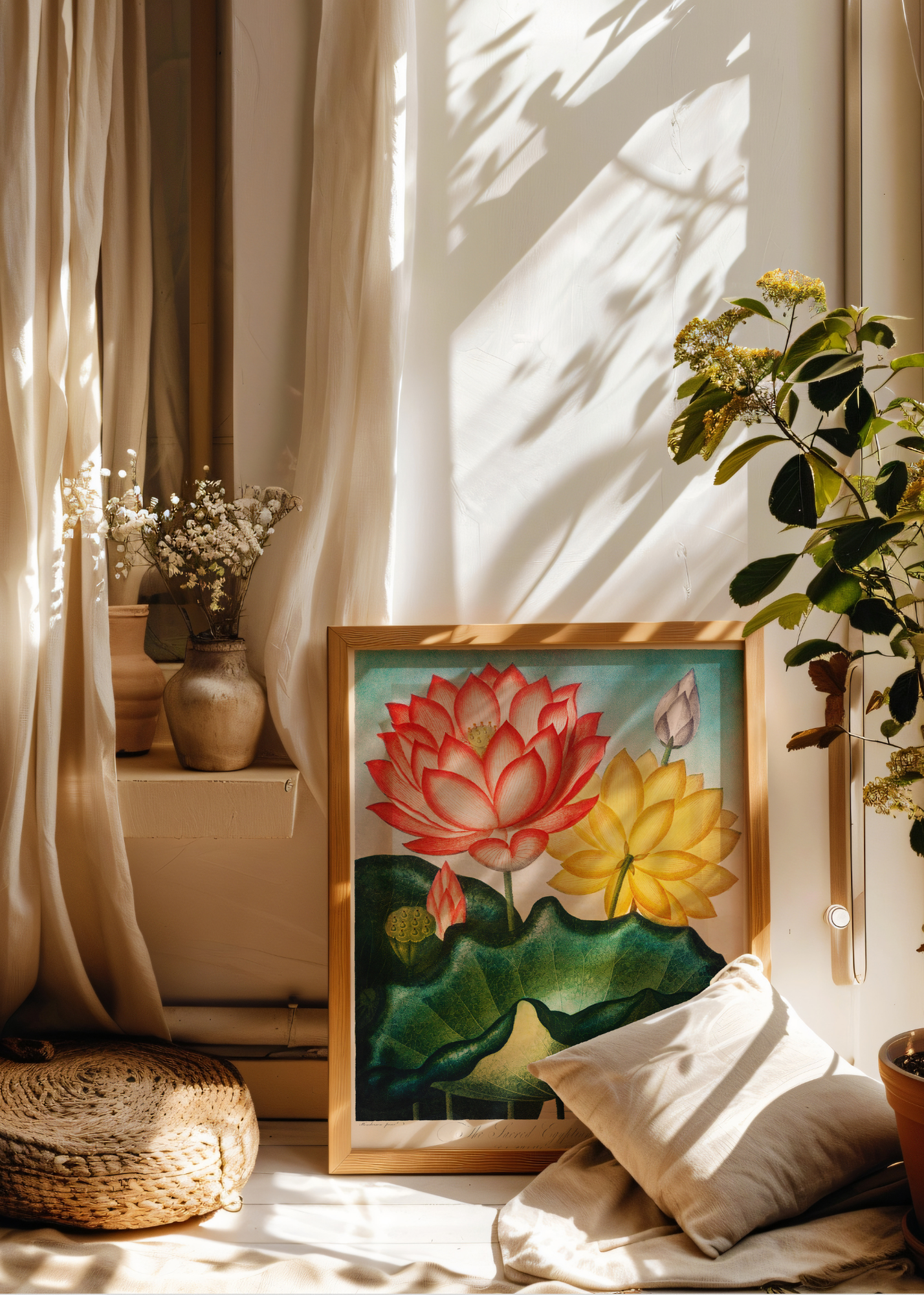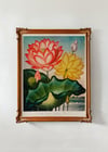 Broad, rounded leaves fan outward with effortless grace, their veined surfaces echoing the rhythms of water and wind. Below, seed pods emerge like sculptural curiosities—symbols of life, continuity, and return. Thornton’s composition feels both scientific and dreamlike, blending precision with a painter’s sensitivity to shape and texture.