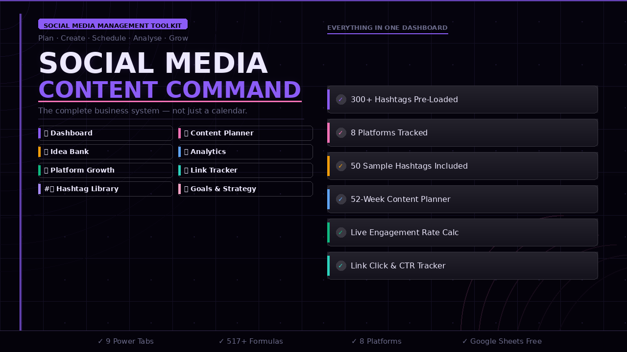 This dashboard changes all of that. Nine professional tabs give you a complete social media operating system β plan a full month in one batch session, track real engagement rates across all 8 platforms, manage 300 categorised hashtags, monitor every link click and conversion, and set quarterly growth goals that actually get reviewed.