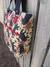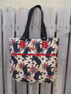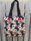 This is a beautiful tote to carry. The bag features a large divided slip pocket on the front, a full gusset, large zipper pocket inside, riveted handles and a magnetic snap closure. This would be a great bag for someone living in the Pacific Northwest, or anyone who loves bears too. This is a one-of-a-kind bag in this print.