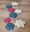 Even though these stars are 3-dimensional they are knitted flat. They have six points, are constructed of short rows and knitted (nearly) all in garter stitch. They come in four sizes and can be used to decorate your house for Christmas.