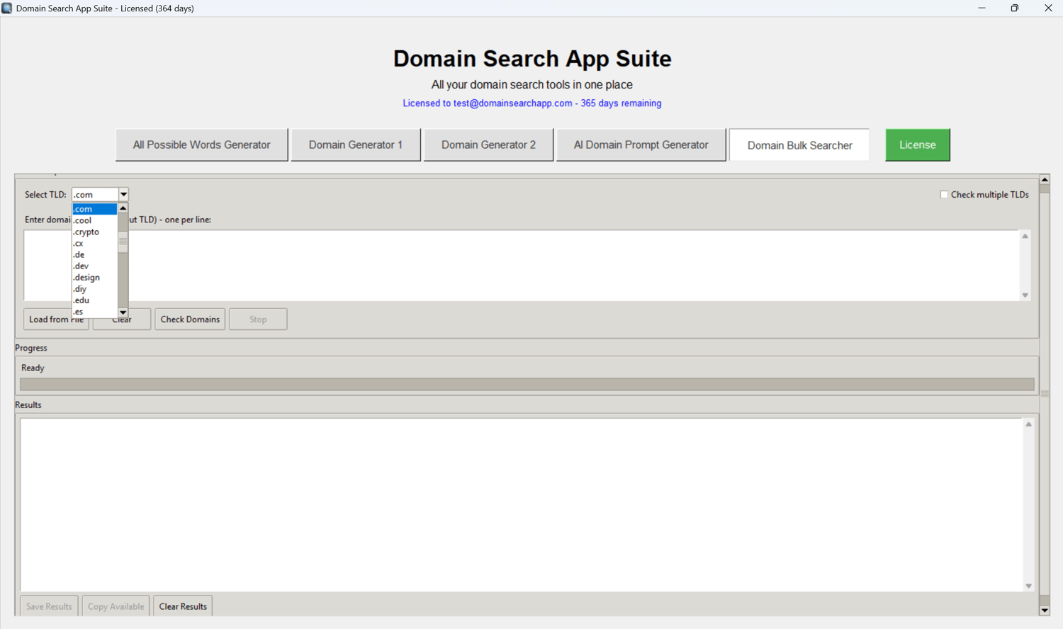 ✅ Domain Bulk Checker – Check domain availability in bulk across single or multiple TLDs.