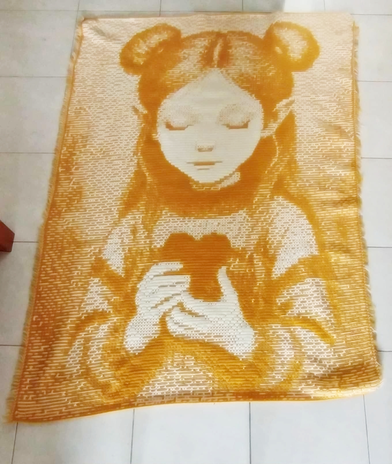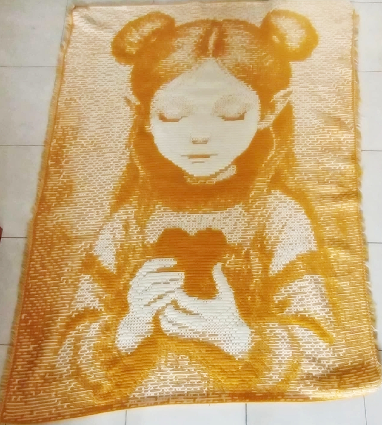 For this pattern, my tester Eva Agustina used a 3.5 mm hook (US-E/4, UK-9) and the measurements with the recommended yarn (Sakura Chunky) were 130 cm (51,1811”) in width and 185 cm (72,8346”) in height without a border, ideal measurements for a Double Bed Blanket size.