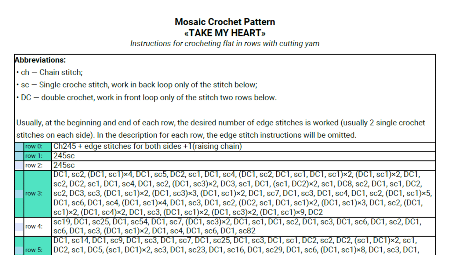- Written pattern, row by row in PDF