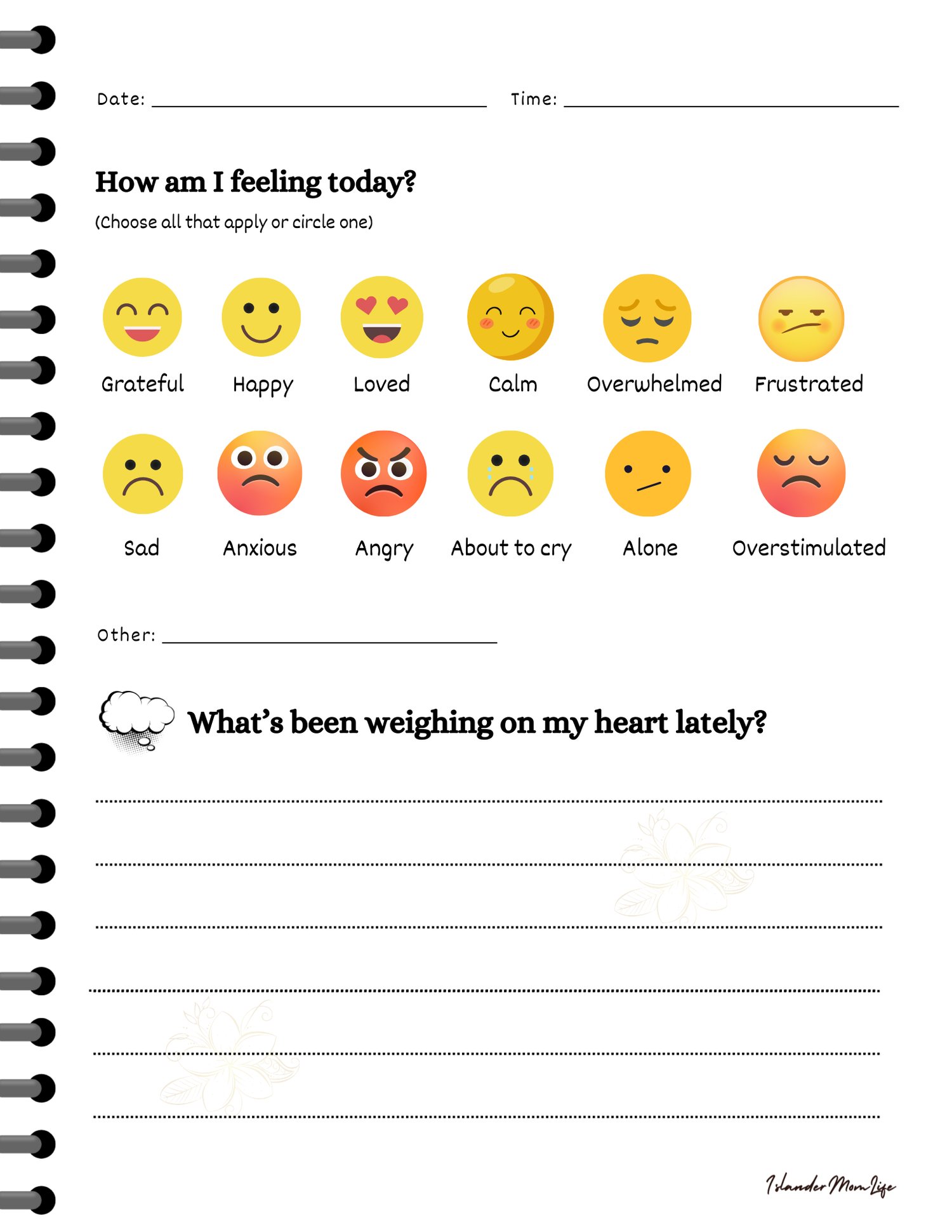 Inside, you’ll find simple, thoughtful questions to help you notice how you’re feeling, what’s weighing on your mind, and what you might need today. At the end, there’s an open journaling space where you can write freely—without rules, pressure, or judgment.
