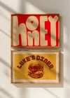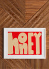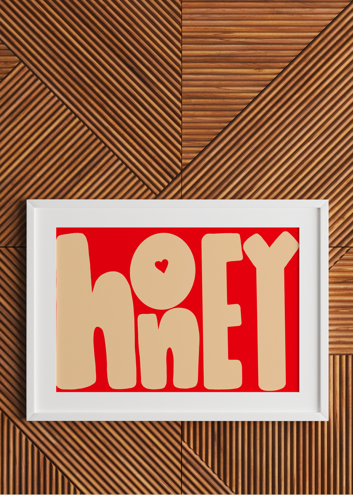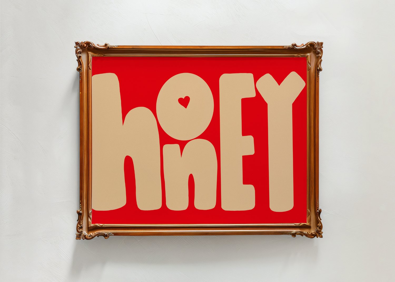 Honey— Set against a juicy, vibrant red backdrop, this playful print features bubbly hand-drawn letters that spell out “Honey”—complete with a tiny heart tucked inside the “o” like a secret smooch. It's flirtatious, sweet, and just a little sticky in the best way. Perfect for a kitchen wall, bedroom nook, or anywhere a little extra sugar is welcome.