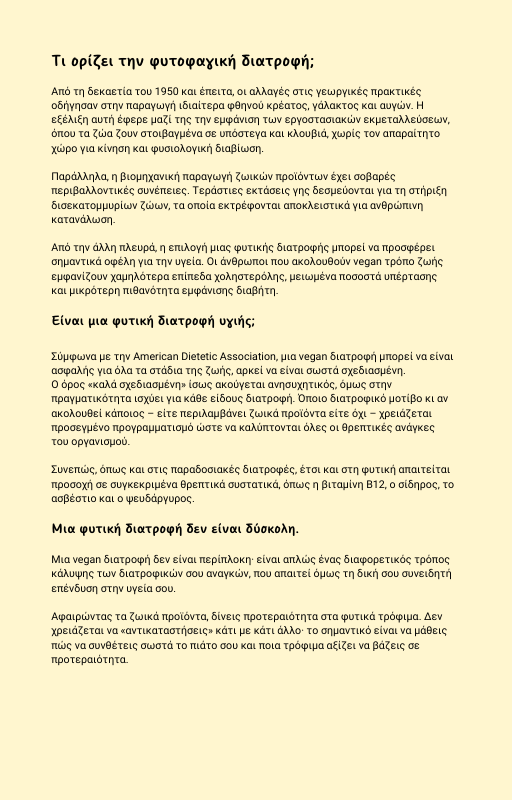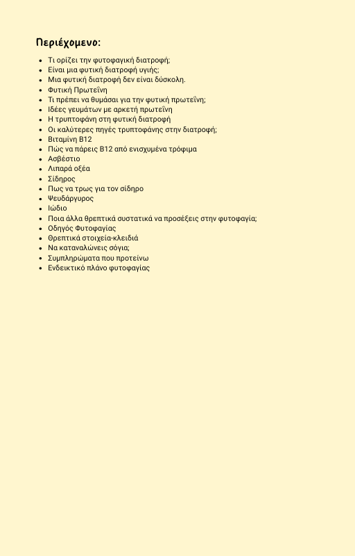 Πώς να εισάγεις περισσότερα φυτικά τρόφιμα στη διατροφή σου; Θέλεις να ξεκινήσεις να δοκιμάζεις περισσότερα φυτοφαγικά πιάτα και να γυρίσεις σε μια αποκλειστικά φυτική διατροφή; Σε αυτό το βιβλιαράκι θα βρεις όλα αυτά που πρέπει να γνωρίζεις και που πρέπει να προσέχεις.