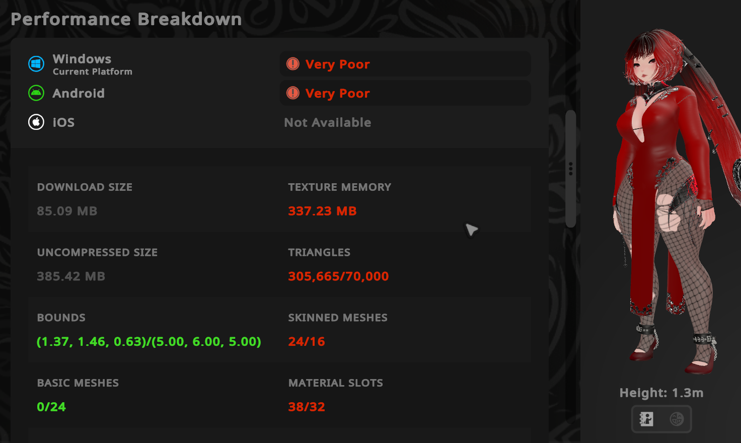 QUEST LIMITATIONS: Only the main hue shift works on quest, I had to remove the fishnets, leggings, long hair, and bodysuit, and both leg chain and bracelet. There is no toggle for the tattoos, and I took off most of the phys bones. All of the textures are still in the project tho, so editing will be required to get the skin tone you want.