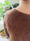 This sweater—with both written and charted directions-—has some easy lace in the yoke and a relaxing stockinette body and sleeves. Worked seamlessly from the top down, it is perfect for trying on as you go. Written in 9 sizes it is meant to be relaxing to create and easy to wear.