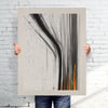 Keys: Minimalist, black, orange, gray, vertical lines, geometric, abstract, graphic design, composition, negative space, balance, contrast, simplicity, clean lines, modern art, contemporary art, Scandinavian design, Bauhaus