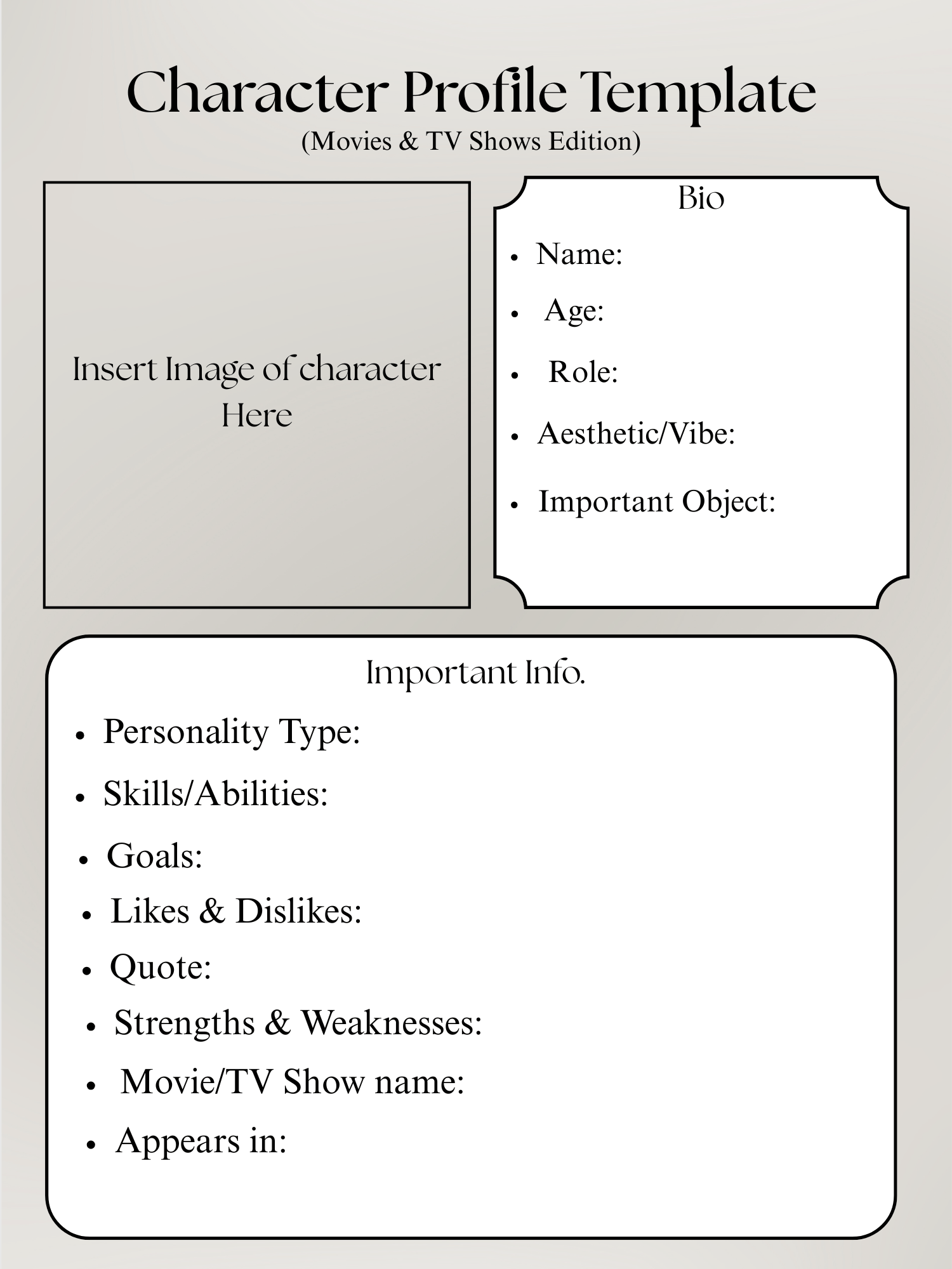 Bring your favorite characters to life with the Aesthetic Movie & TV Character Profile. Looking for a sophisticated, distraction-free space to record your character studies or track your favorite fandoms? This template is a beautifully minimal sanctuary designed for those who find inspiration in the magic of storytelling.