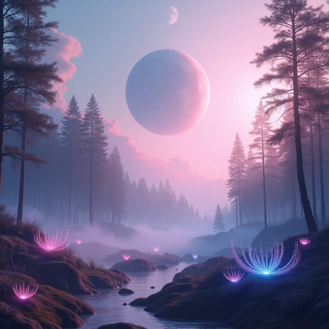 The still cover artwork represents the larger alien world this scene belongs to — a mystical forest under twin planets in a rosy-blue sky.