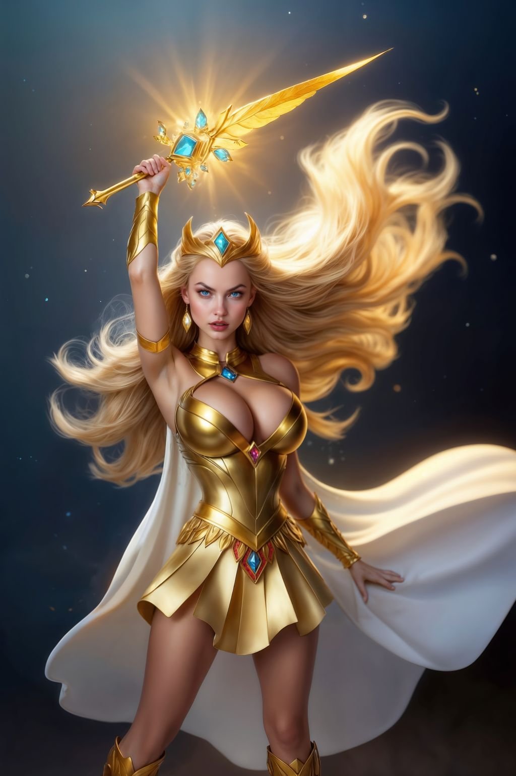 This 14K She-Ra–inspired cosplay artwork is a love letter to the legendary Princess of Power: golden battle armor that gleams like forged sunlight, gemstone accents that feel straight out of Etheria, and the iconic Sword of Protection / Sword of Light lifted high—glowing with transformation-level intensity. Everything about the scene screams heroic fantasy: wind-swept hair, regal confidence, and that larger-than-life aura that makes She-Ra instantly recognizable.