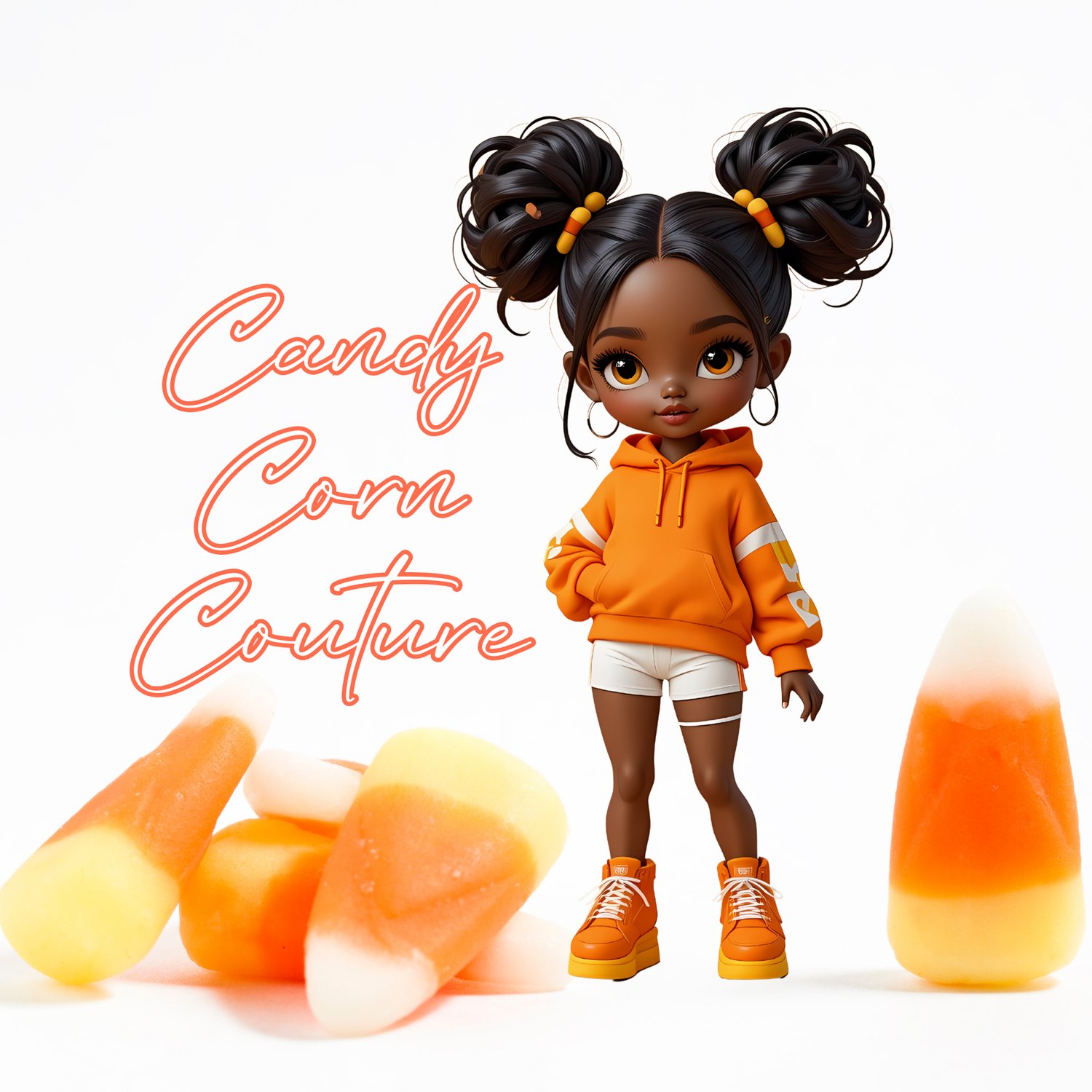 Each character in this collection is beautifully rendered, showcasing a stunning variety of hairstyles, from chic bobs and playful space buns to elegant braids and flowing waves. The outfits are inspired by the iconic orange, yellow, and white of candy corn, reimagined into modern hoodies, stylish dresses, cute overalls, and chic separates. These dolls aren't just ready for Halloween; they're ready for the runway!