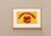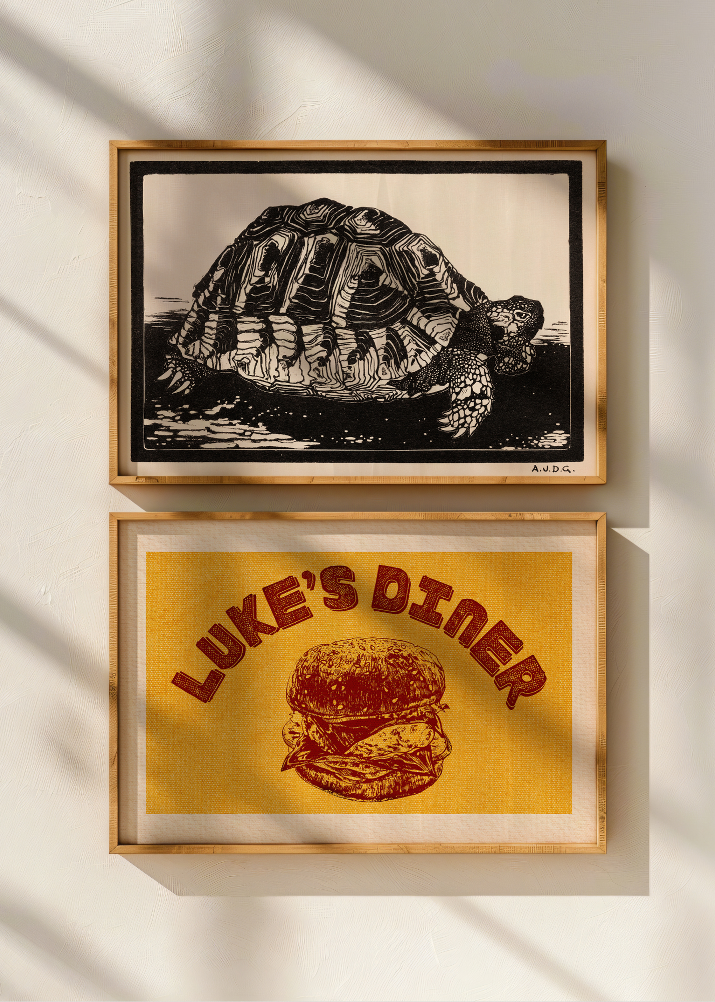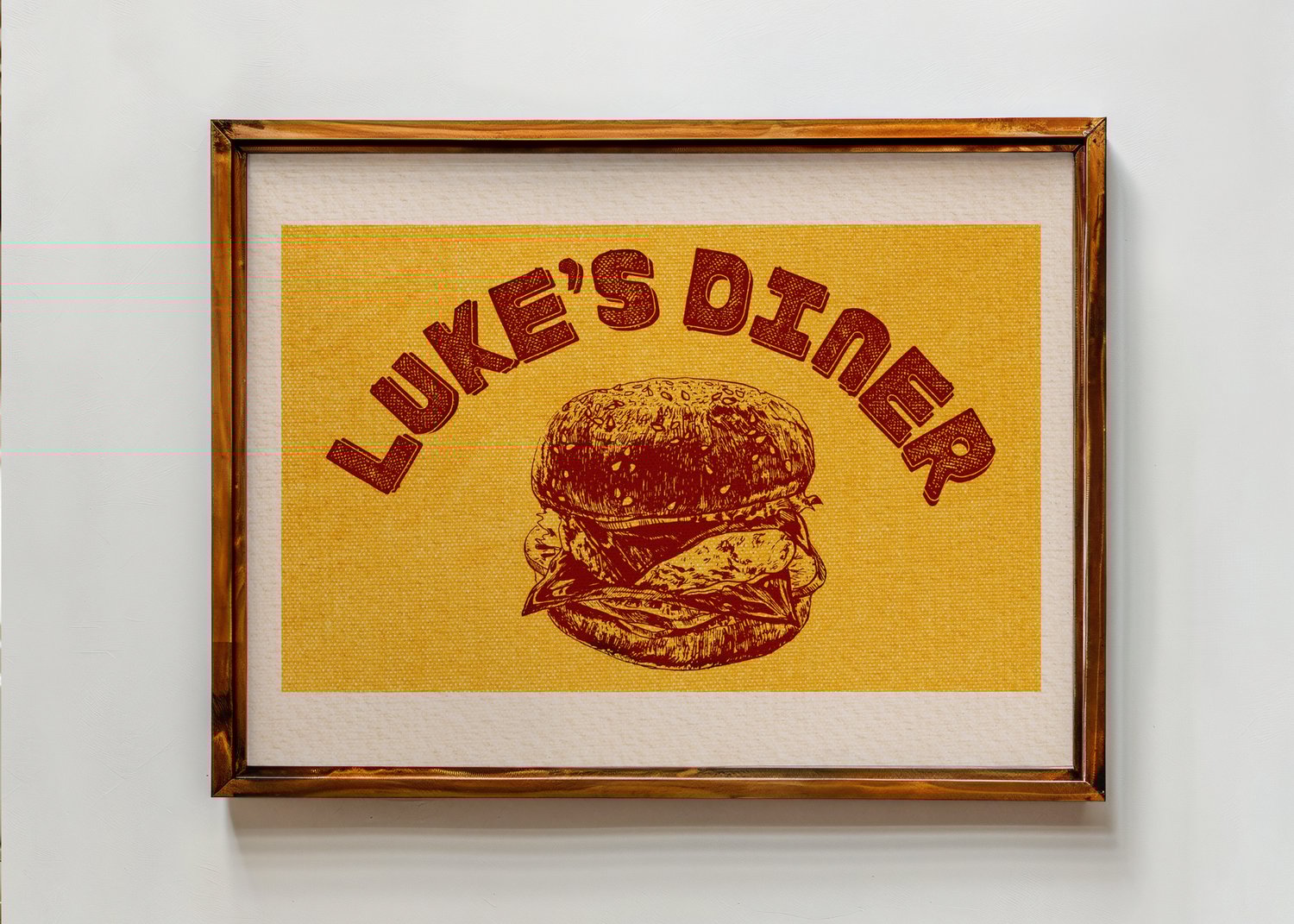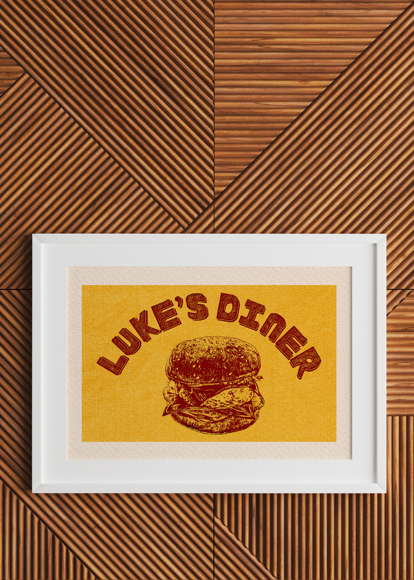 Luke's Diner— A golden-yellow paper-textured background features “Luke’s Diner” in bold maroon letters, It's all cozy familiarity—Stars Hollow charm, Luke and Lorelai banter, and a steaming cup of coffee in the corner booth. With a juicy cheeseburger, of course.