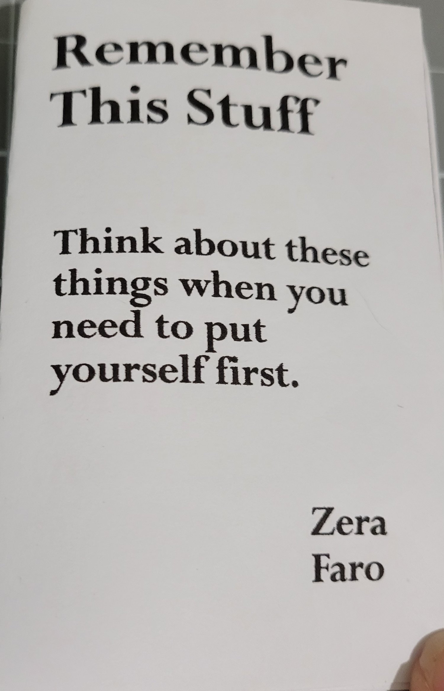 "Remember This Stuff" is a mini-zine of things you should remember when you need to be nicer to yourself. Words of encouragement and self-help from one stressed-out human being to another.