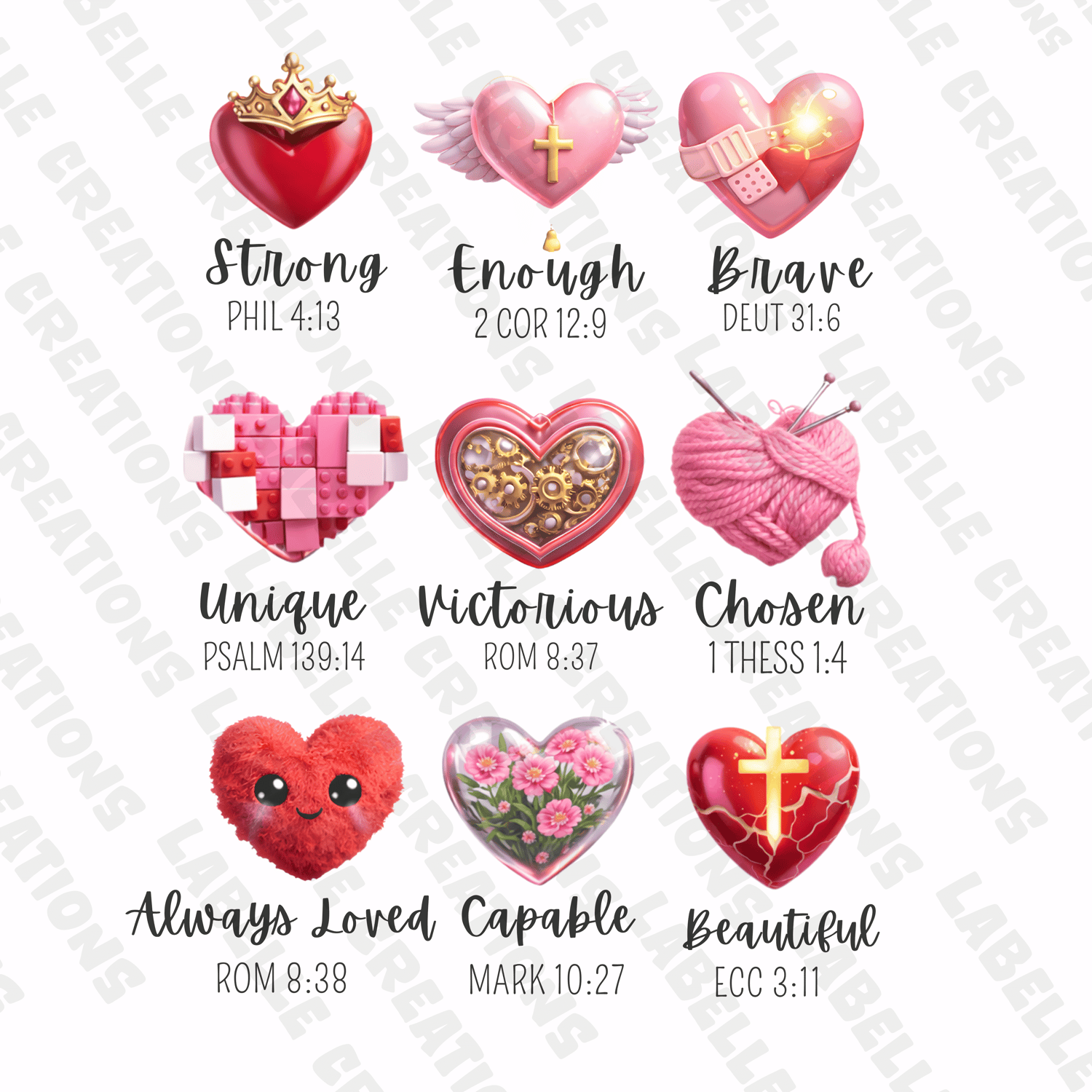 This uplifting digital artwork features nine beautifully illustrated hearts; each paired with a powerful affirmation and corresponding Bible verse reference. Every heart has its own unique visual style — from crowns and wings to florals, yarn, gears, and light — symbolizing identity, strength, healing, creativity, and faith.