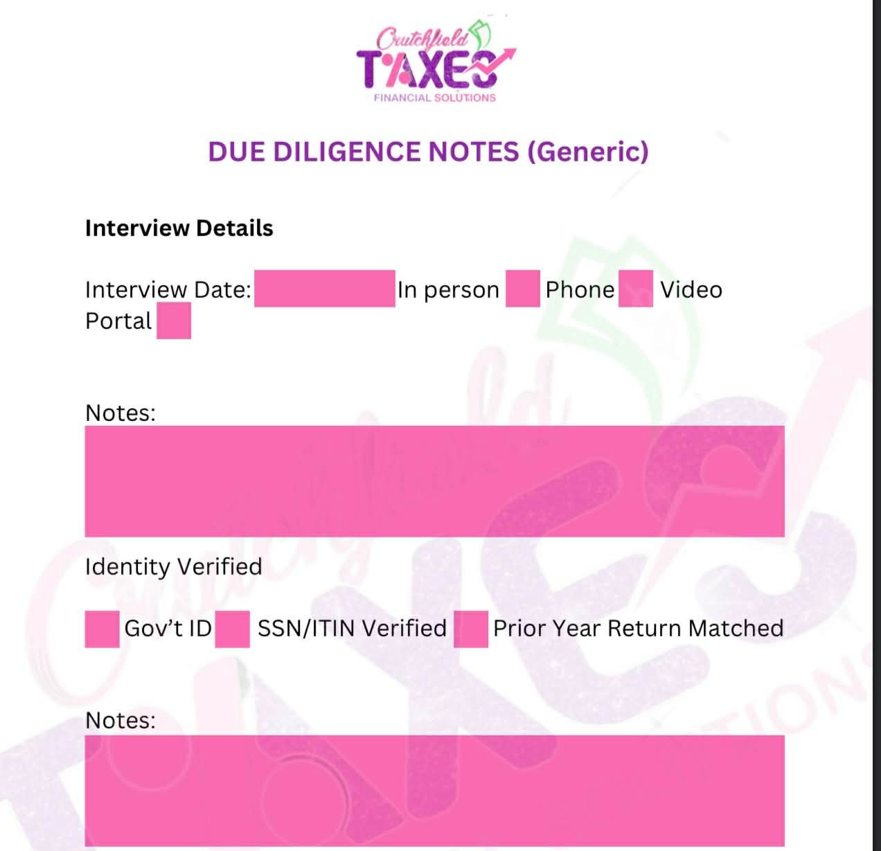 Stay compliant and organized with the Due Diligence Notes (Generic)! 📝💼 This 3-page editable template helps tax professionals document client information, interviews, and verification details accurately. Perfect for maintaining proper records and meeting IRS due diligence requirements with ease!