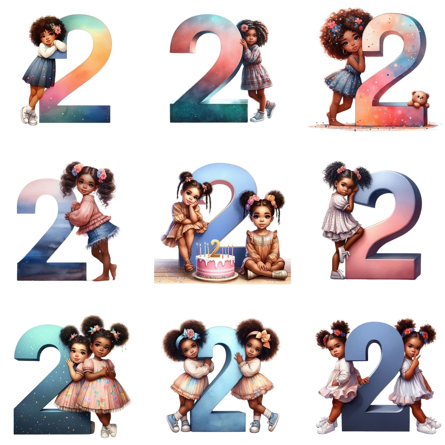 Second Birthday | Number Art | Black Girls | Baby Birthday Clip Art