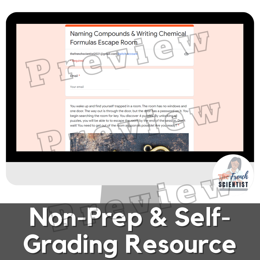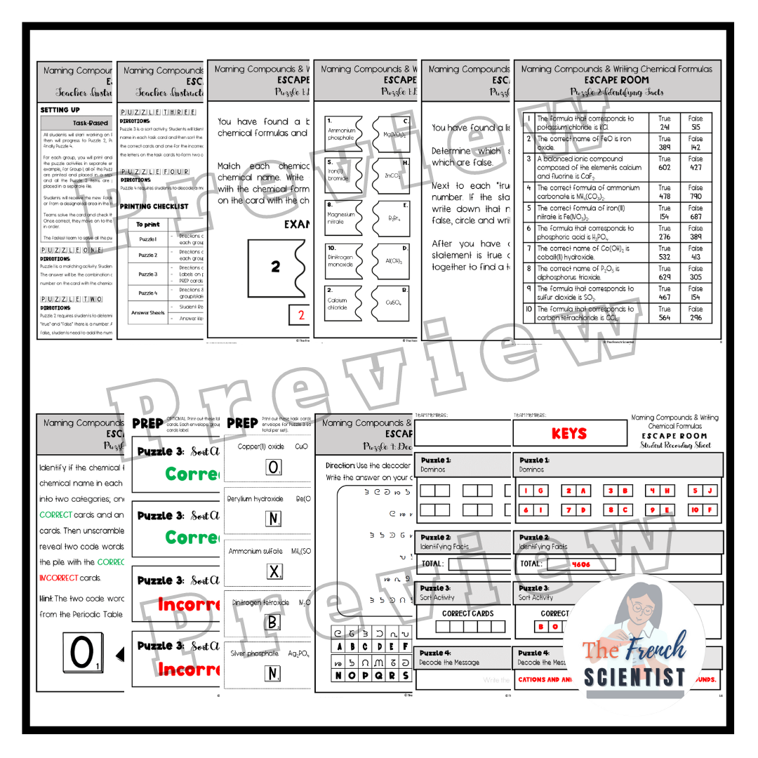 CHEMISTRY Naming Compounds & Writing Chemical Formulas Escape Room Activity contains 4 puzzles to solve. It is a great resource intended to reinforce students' understanding in class as a part of the warm-up, review tasks, or end-of-year test prep.
