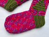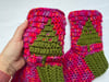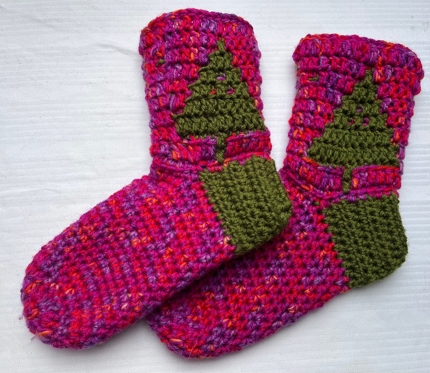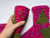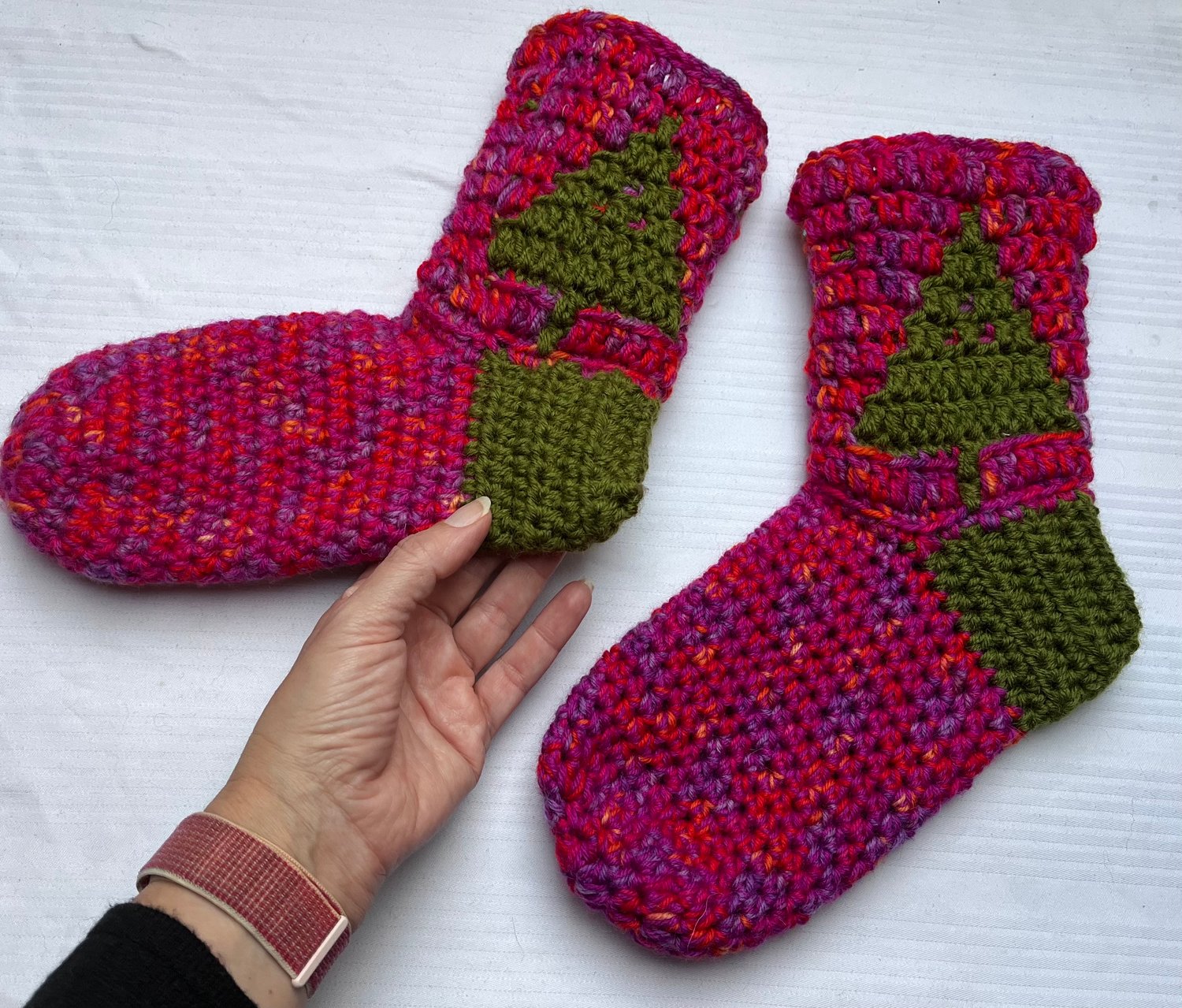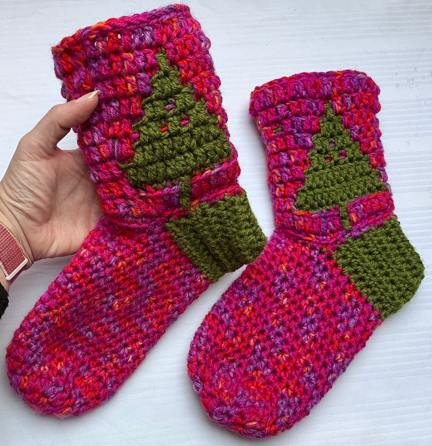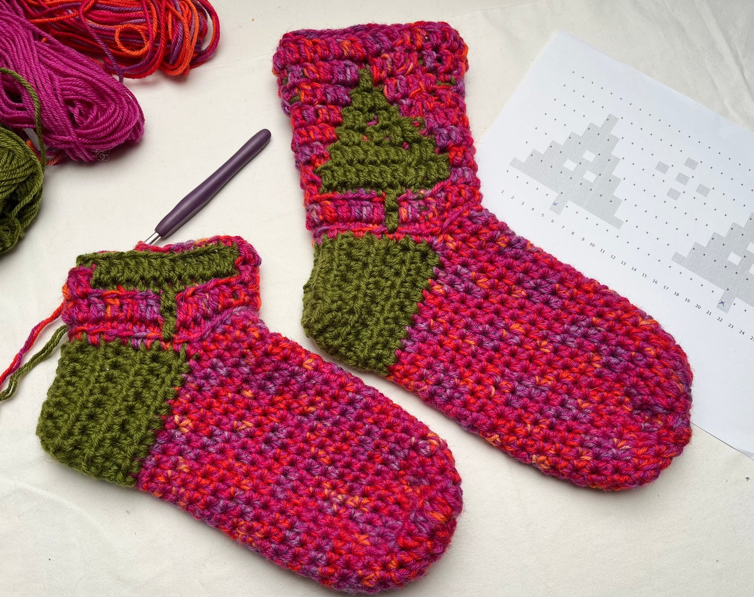 The heart of this project is the mosaic pattern featuring a simple Christmas tree and lights, designed to be easy to follow even for beginners. Moreover, you can adjust the pattern to your liking. I crochet them using the warm Abby 200 yarn, which ensures softness and durability, perfect for wearing around the house. Using three balls of colored yarn (dark pink, vibrant multicolor, and green for the tree) gives the socks an extraordinary, colorful look.