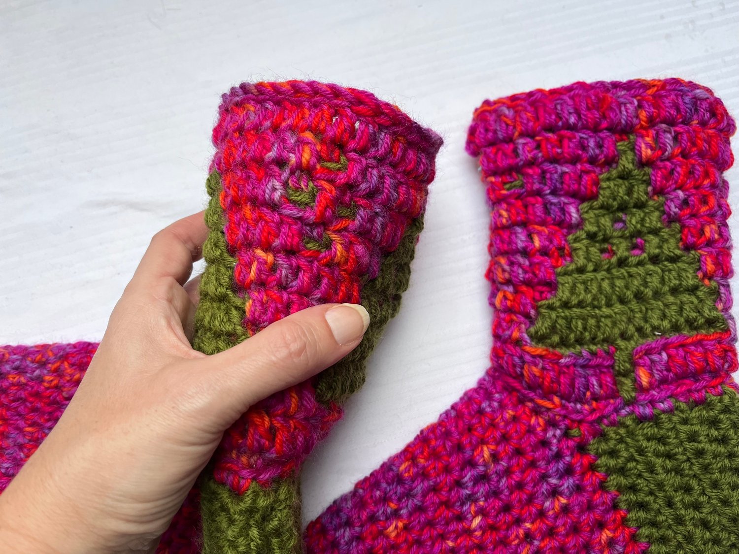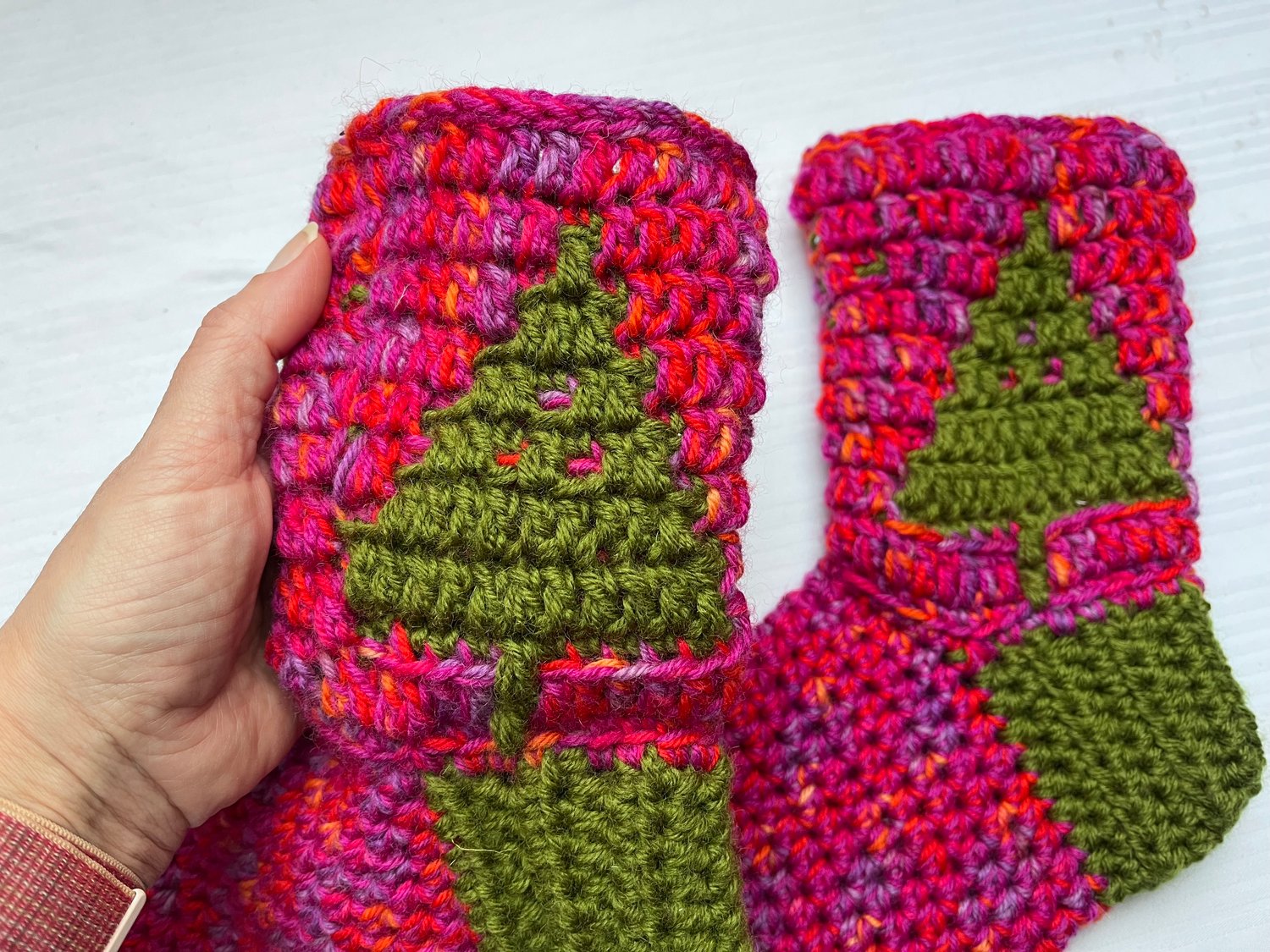 These crocheted Christmas socks with a tree and ornaments are not only a cozy accessory for cold days but also stylish, handmade footwear – perfect as sock-slippers! This project is ideal for those who want to decorate their feet with a Christmas motif while getting acquainted with the mosaic crochet technique.