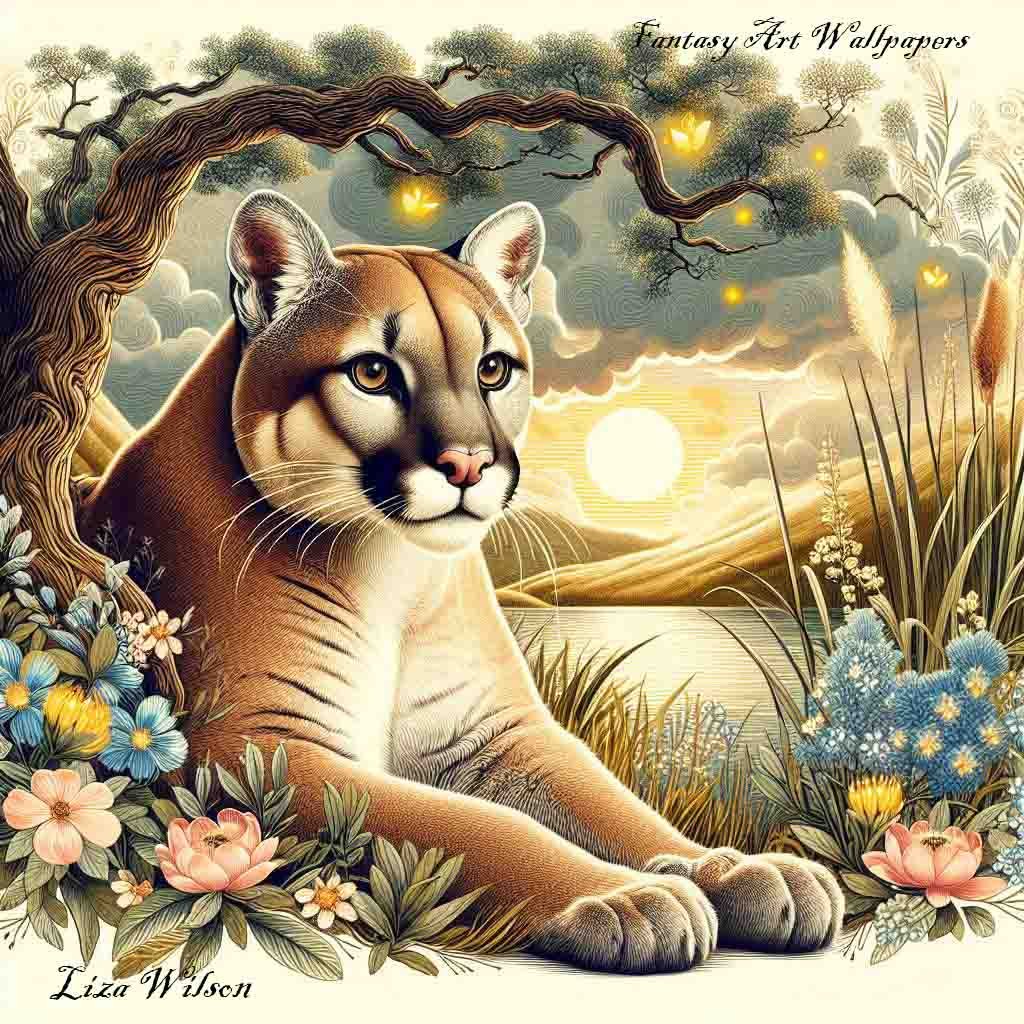 Puma beside a sparkling lake with a setting sun. There are wild flowers and trees & fireflies.