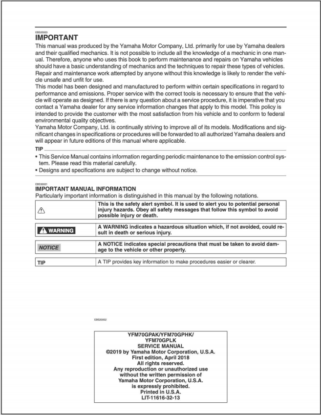 2019-2020 Yamaha Grizzly 700 EPS 4WD Base Hunter SE SE Black XT-R Service Manual Part No. LIT-11616-32-13