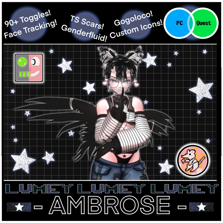 Quest Differences- No VRC FT, No Hues, No Outline Toggle, Decals (TS Scars) No Human socks, No Platform Shoes, No Addon 1 (Horn). There will be clipping on quest that isnt on PC as I need to compress Quest FBXs. Phys-bone delegation- Butt, Chest, Tummy, Main Hair (Includes Bangs, Long Back Hair, Poke ear, kelpie ears, Head fins,) Sleeves, Tail (All Tails have light movement), Many are on the same components. See Quest Showcase to see!