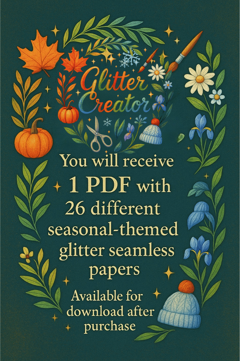 Bring the magic of every season together with these breathtaking seamless glitter designs! Each season has six stunning digital patterns for Winter, Spring, Summer, and Autumn.
