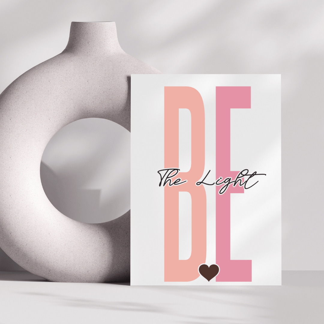 A warm, minimal greeting card that speaks with calm confidence. Large, overlapping letters form a bold backdrop in soft blush and rose tones while a handwritten-style script overlays the center with the words “The Light.” A small heart at the bottom adds a quiet, tender finish. The design leaves plenty of white space for a personal message and feels like a gentle note passed between friends, mentors, or anyone offering encouragement. Add a clean white envelope so your message is ready to send for moments when support, congratulations, or simple kindness matter most.