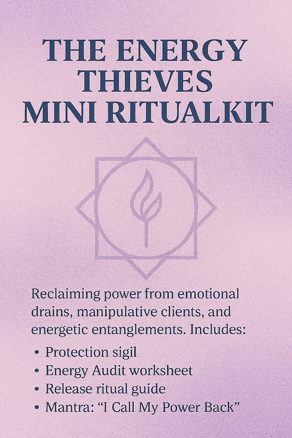 A sacred toolkit for reclaiming your power from emotional drains, manipulative clients, and energetic entanglements. This mini ritual kit offers both poetic invocation and practical clarity—designed for healers, creatives, and boundary-builders who are ready to call their energy home.