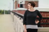 A top-down raglan pullover with lace decoration on the raglan seamlines, three-quarter length sleeves, and a high-low ribbed flounce attached at the hem. Fingering weight yarn is held double for the body of the sweater and the skirt is worked in laceweight.