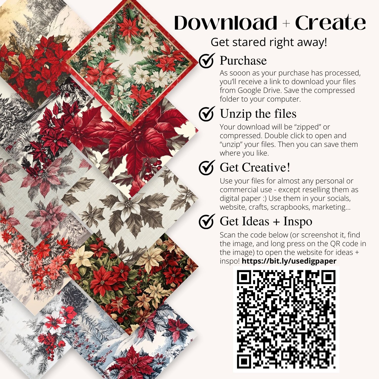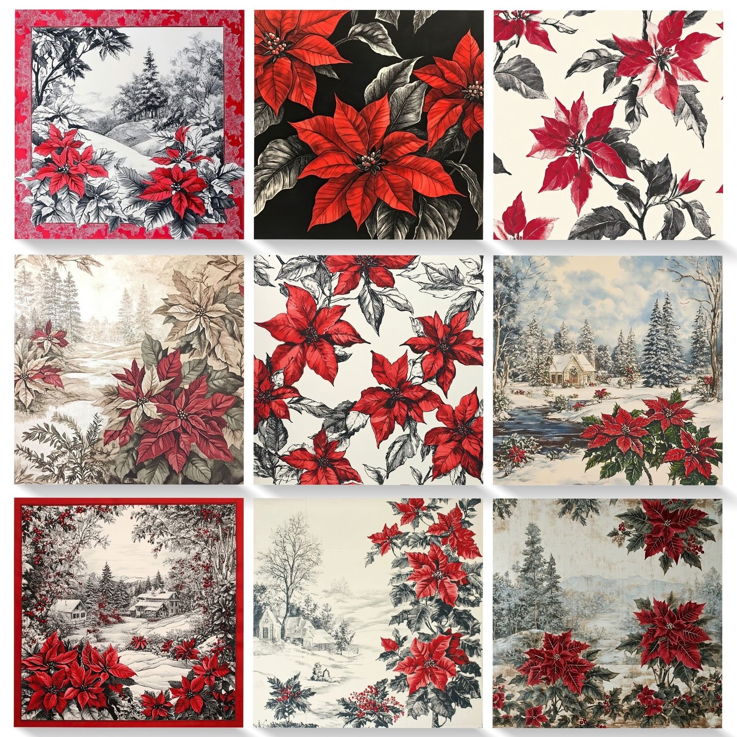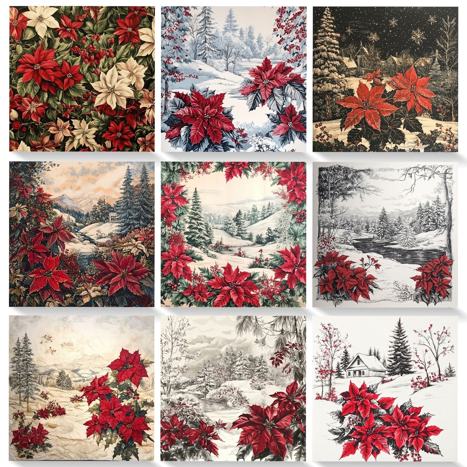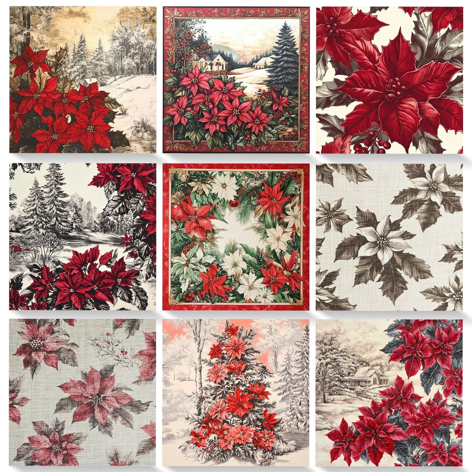 ✨ 30 JPG files – 12x12 inches, 300 DPI, high-quality vintage poinsettia and winter scene designs.