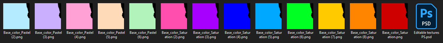 - PNG textures, customizable and editable in Photoshop, Each variant comes with its own recolor (the cover images are assembly examples)