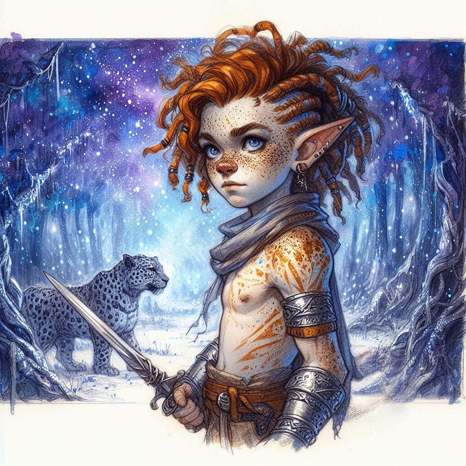 A Cute little warrior Elf boy with red dreadlocks & a Leopard in a magical forest.