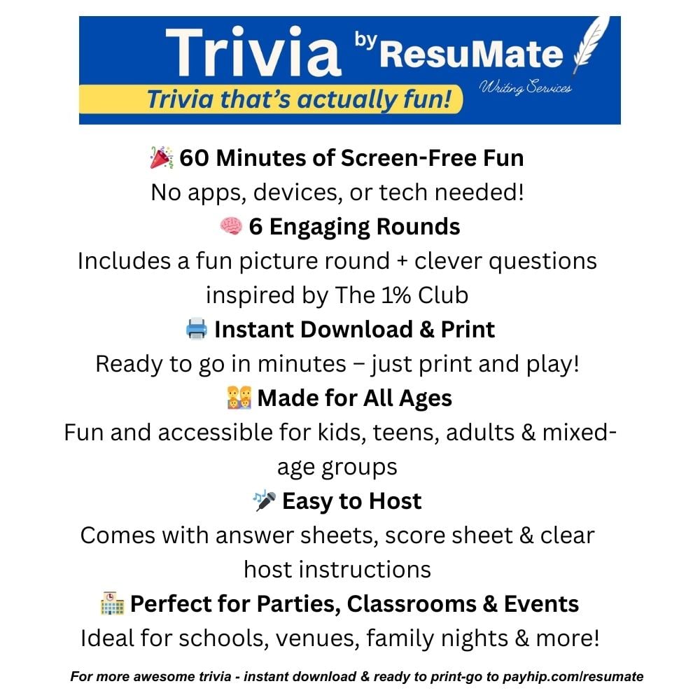 Looking for a fun, interactive activity that brings everyone together? Our Trivia Family Pack is the ultimate screen-free game for parties, classrooms, family nights, community events, and venues. Packed with fun and interesting questions suitable for all ages, this printable trivia game guarantees laughter, learning, and connection – no phones or fancy tech required!