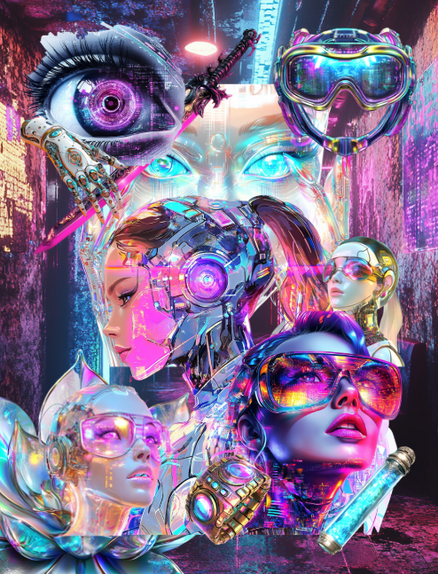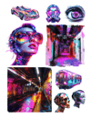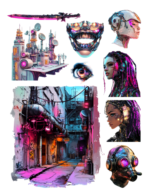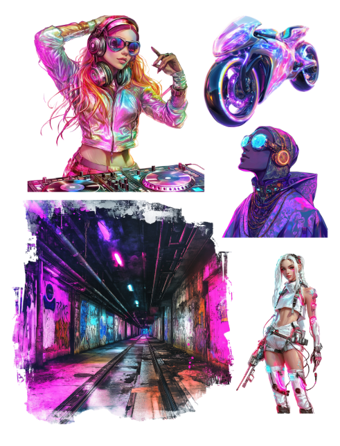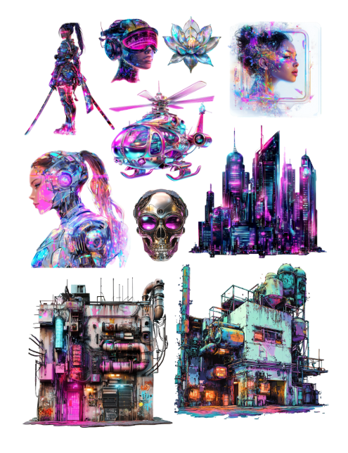 This Cyberpunk Ephemera to cut and collage book is full of fun new ephemera concepts from a genre called cyberpunk which showcases graffiti, dark alleyways, grunge, garbage, computer geeks, hackers, neon DJs, AI, tuk tuks, trains and subway stations, dirty cities and cityscapes, butterflies, hoverboards, cars, motorcycles, lots of cyber girls and guys, warriors and geisha, hacker scenes and much more. It's so fun!
