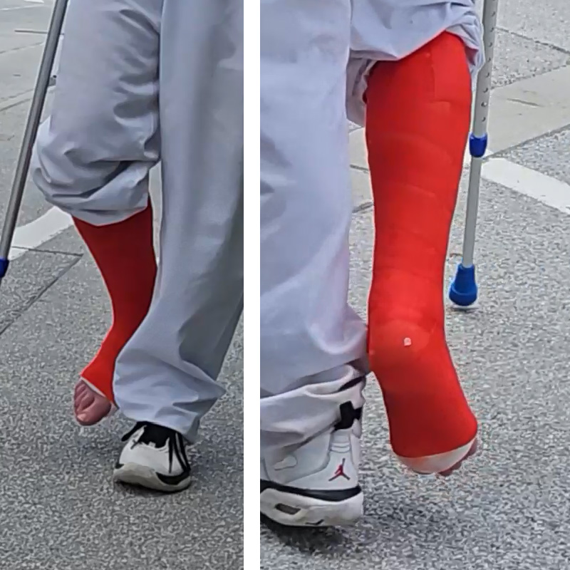 His right leg is fixed with a gorgeous circular fiberglass SLC...he chose RED as his color...just wonderful!
