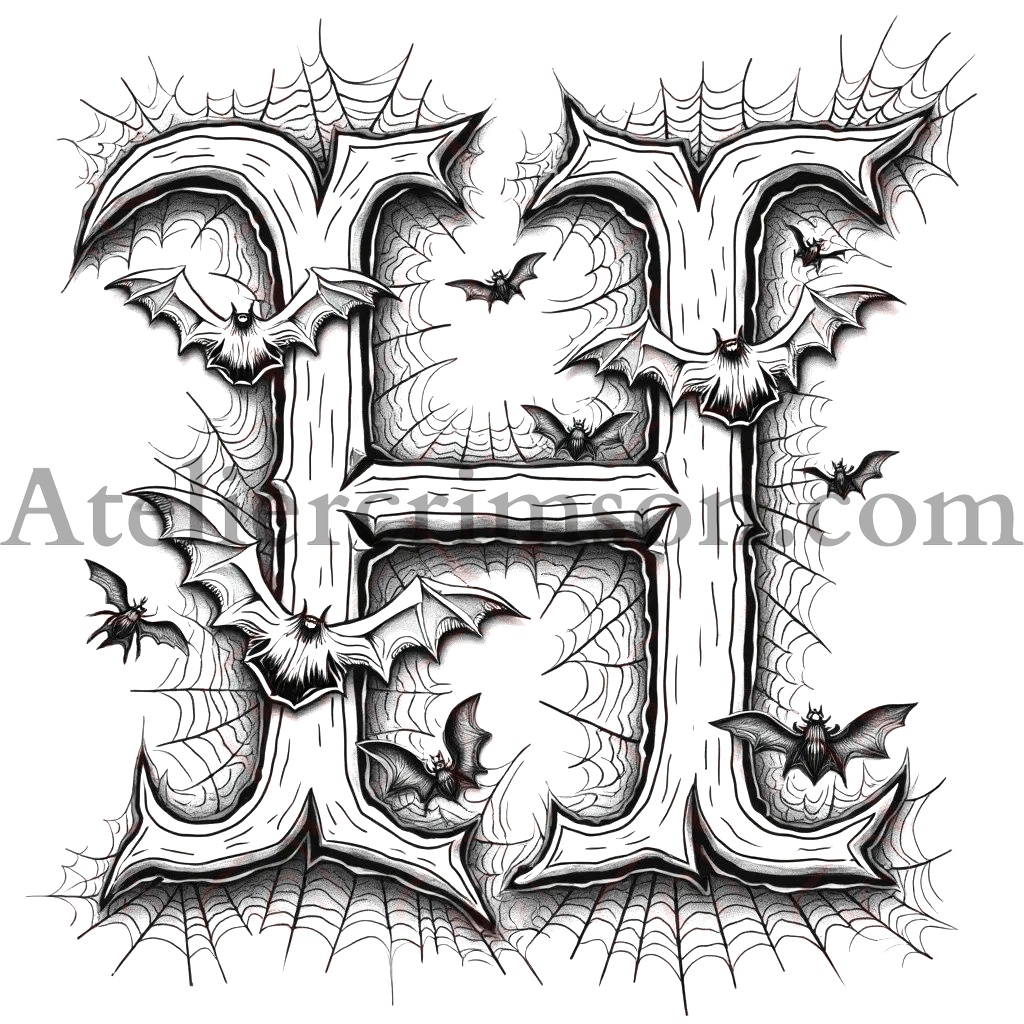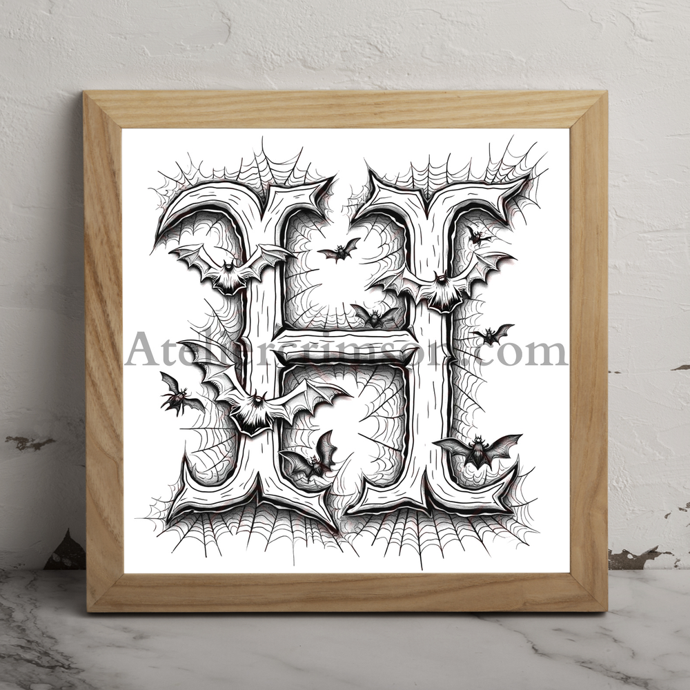 The letter H coloring book halloween occupying 90% of a 1024x1024 image. Use an Old English font style with clear outlines resembling a coloring book page. The character is composed of intricate bat silhouettes, creating a spooky Halloween atmosphere. Use only pure black (#000000) for the character and outlines, and white for the background.2D, black and white style resembling a high-quality adult coloring book page.