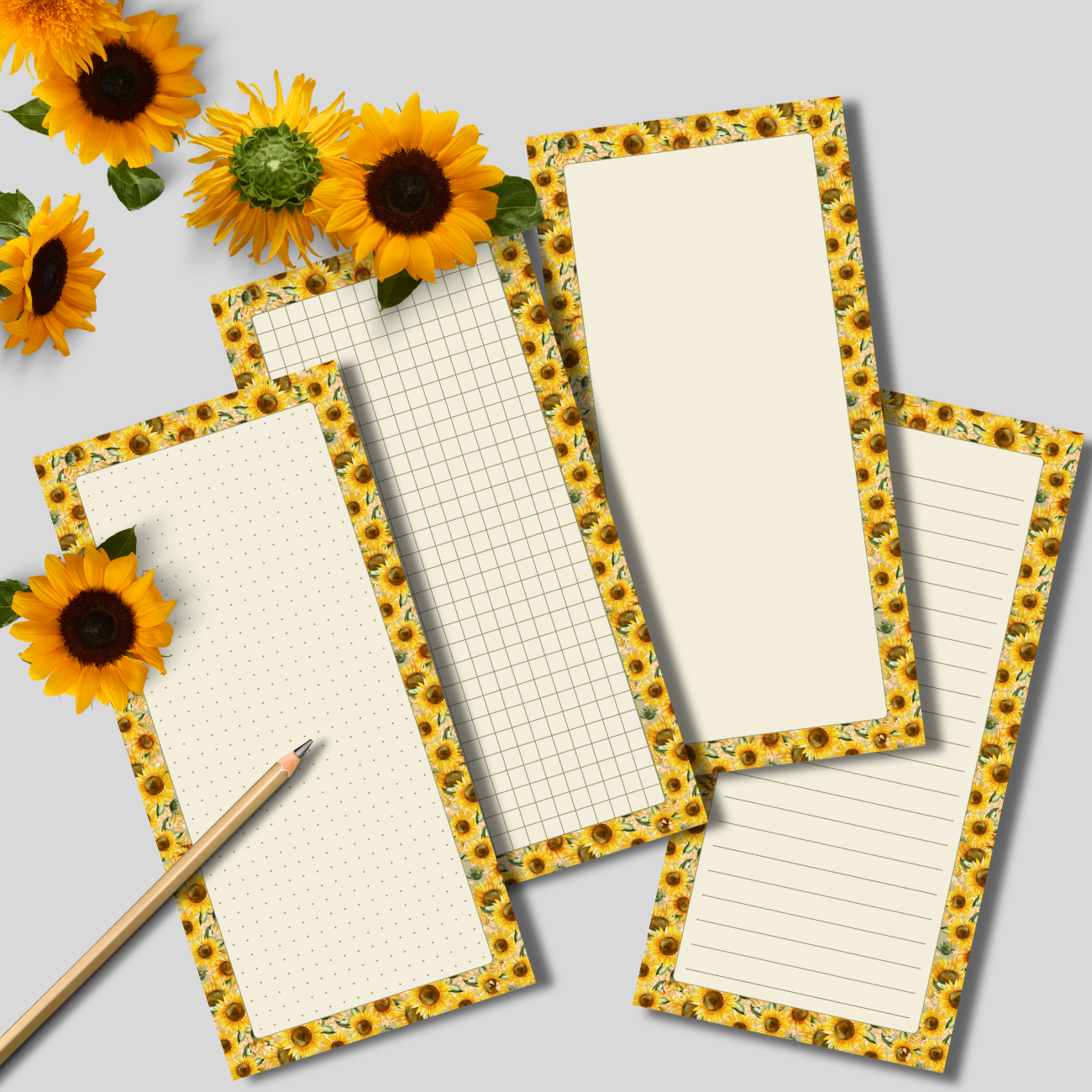 Looking for cheerful and functional planner pages? The Sunflower Sunshine Notepad Set brings a pop of warmth and purpose to your daily routine. Each page is designed with vibrant sunflower borders and includes four formats: lined, blank, dot grid, and square grid. Whether you’re journaling, sketching, planning, or list-making, these 4.5"x9.25" notepads offer a flexible and delightful way to stay organized.
