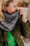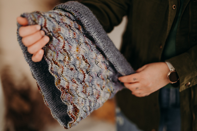 This cowl is worked seamlessly in rounds from a provisional cast-on. The first half (outside) of the cowl is worked in DK weight in an eyelet cable pattern; the second half (inside) is worked in Stockinette stitch in double stranded lace weight yarn, creating a peek-through fluffy lining. The layers are joined with Kitchener stitch.
