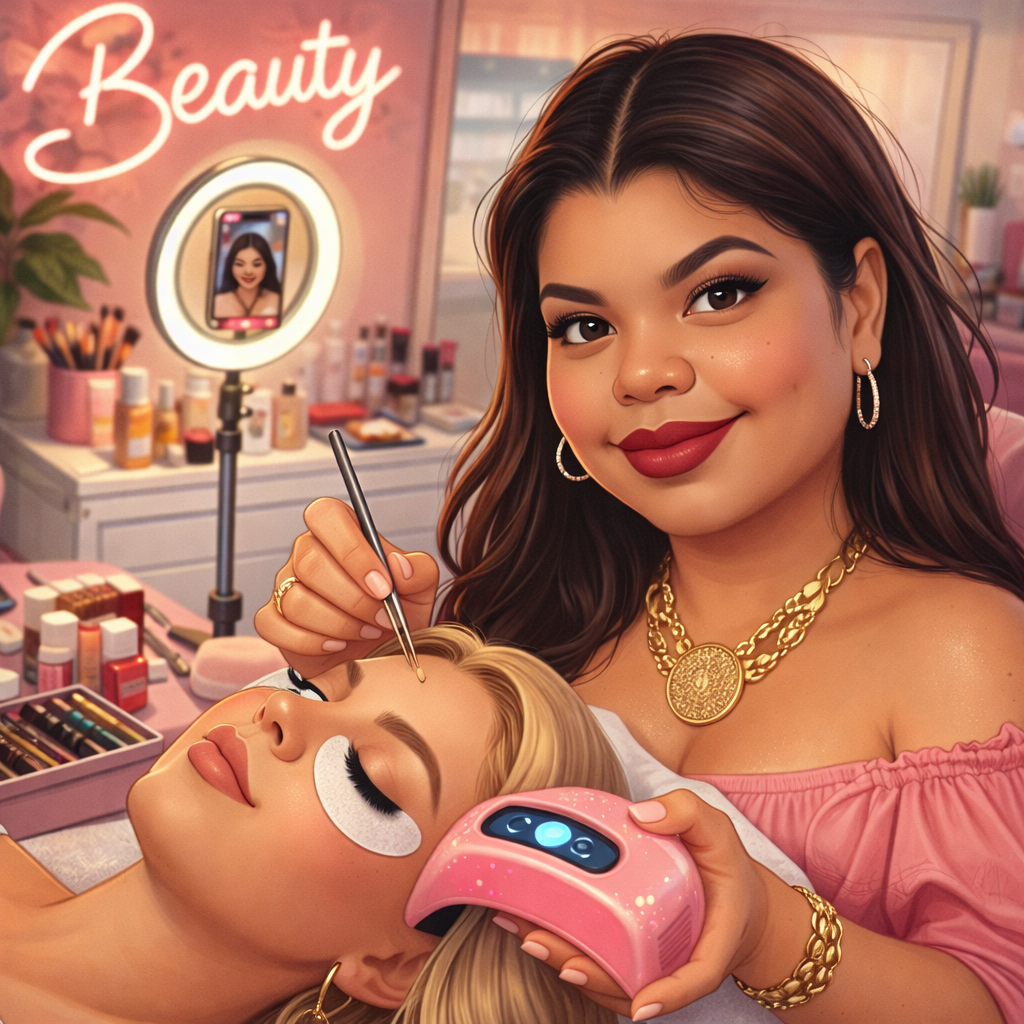 A vibrant, pink-toned caricature of a beauty technician working in a bustling salon environment. The character at the center is designed with features inspired by the provided reference photos, including long, dark hair, large hoop earrings, and a bright smile.