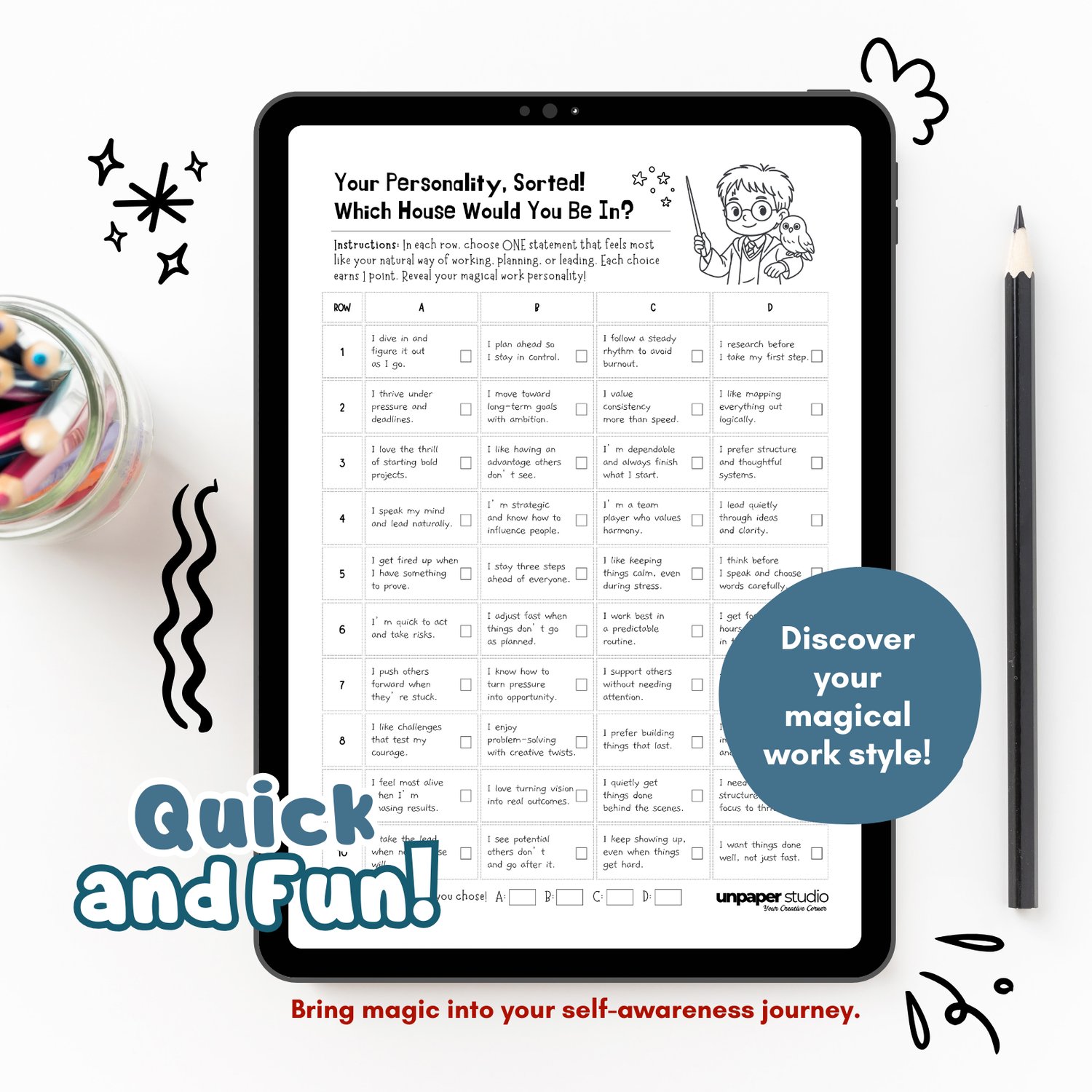 Discover your magical work personality with this fun and reflective Hogwarts House x DISC work style quiz! Blending familiar house traits with real-world DISC styles, this printable helps you explore how you naturally get things done—whether you're a dream-chasing student, a creative professional, or a curious Potterhead.