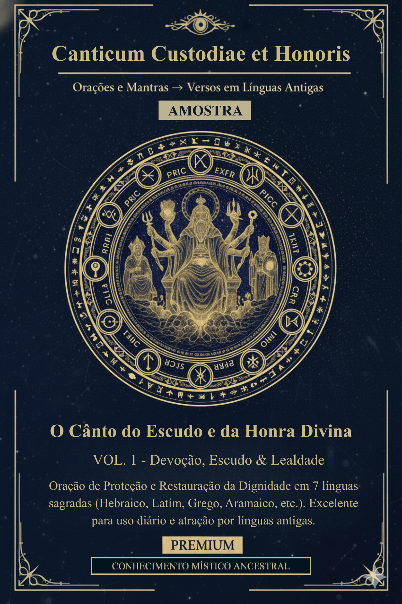 Este é o cântico cerimonial, entoado em 7 Línguas Sagradas, que ergue sua custódia. Você aprenderá a invocar o Fiat Ordo et Lex para que a Justiça Divina "dê forma ao Caos". O segredo reside no Rito do Escudo Triplo (Custodia Triformis), que usa a Voz, o Nome e o Silêncio para selar seu corpo, mente e espírito.
