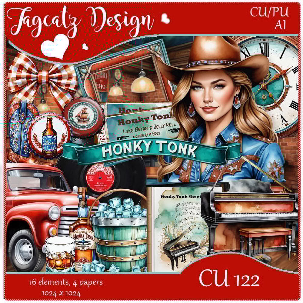 16 elements and 4 papers all with a western/Honky Tonk theme. AI generated. CU or PU. 1024 x 1024 saved at 300dpi.